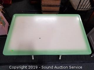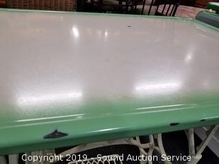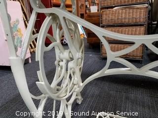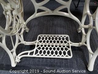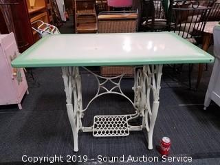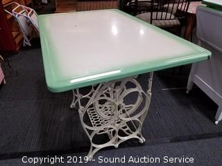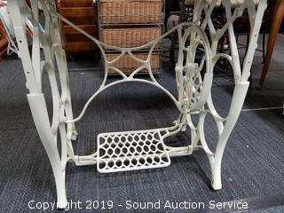 Item Description: Base is repurposed from a treadle sewing machine. Approx. 29" H, 40" x 25". A couple wear spots in the enamel.
