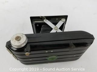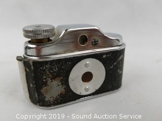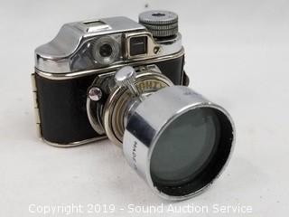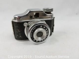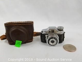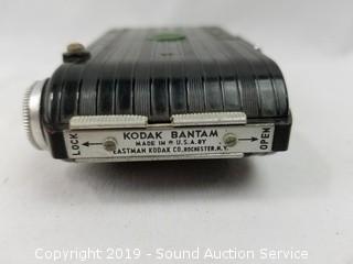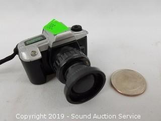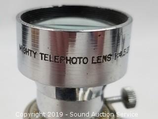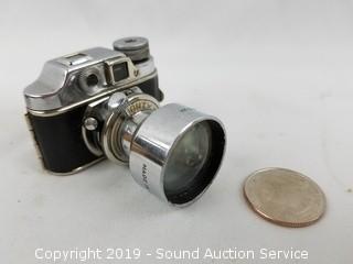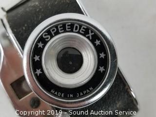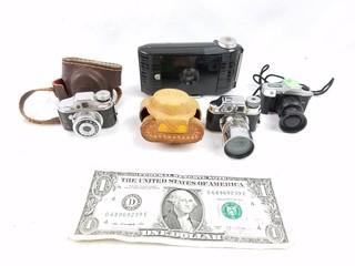Item Description: Mighty Toko with leather case and telephoto lens accessory, miniature digital camera decor, Speedex miniature camera with leather case, and Kodak Bantam camera. Miniature cameras are 1.5" x 2" x 1-1/4".