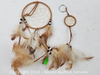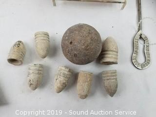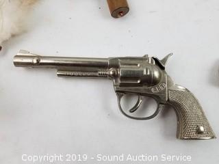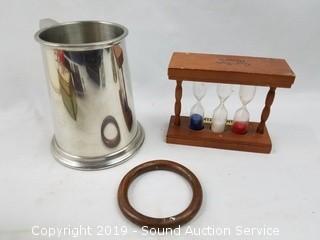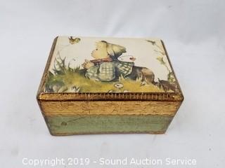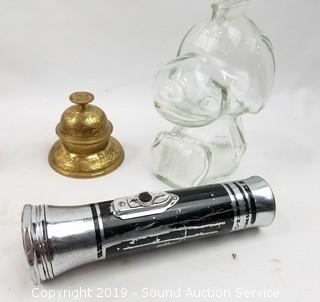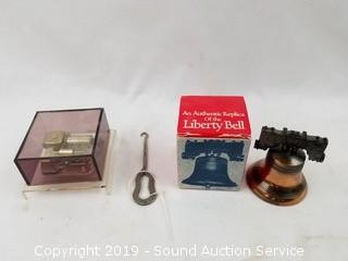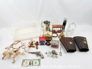 Item Description: Glass Snoopy coin bank, English pewter "Best Man" mug, leather braces, Hummel Swiss movement musical trinket box, Great Smokey Mountain sand timer, vintage metal Ever-Ready flashlight, dream catchers, replica Liberty bell, old lead bullets and musket ball, Hubley cap gun, copper ring, wood ornaments, brass bell, and more. Tote with lid included.