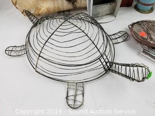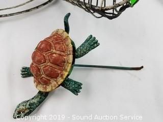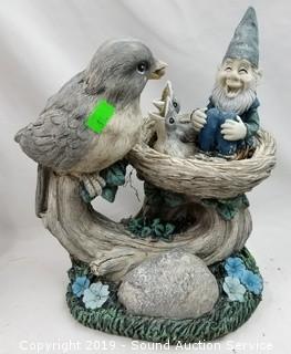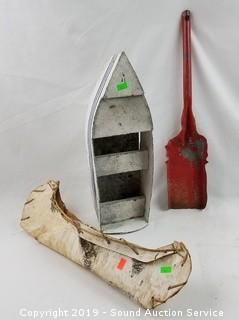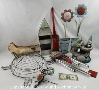Item Description: Metal Boat, Gnome in a Bird Bath, Bark Canoe, Metal Turtle, Metal Flowers & Windchime.