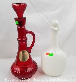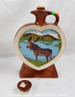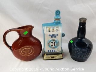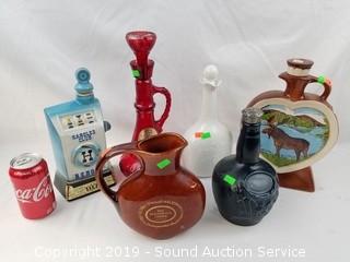 Item Description: Jim Beam, Royal Copenhagen, Royal Haliburton Mooseheart (Lid has come free from cork), Blue Wade Liquor Bottle, & Presidents Choice Pitcher. 7" to 13" tall.