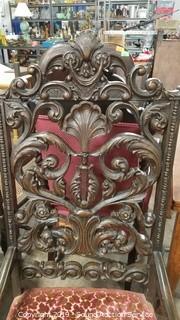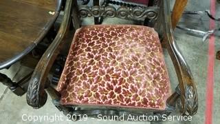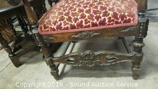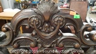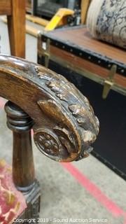 Item Description: Even with its flaws (missing a carved piece on the back, Upholstery has some fading, some wear to the finish), still a great piece. 53" H x 22-1/2" W x 25" D.