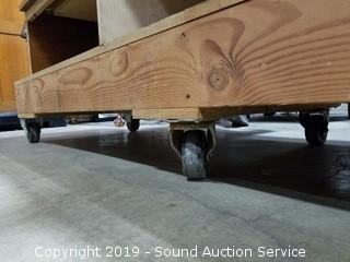 Item Description: The table saw has had a table built around it with large casters for easy movement, comes with fence and miter gauge. Has been sealed in with pray on foam. Overall 36" H x 72" W x 42" D.