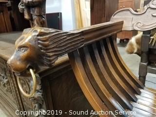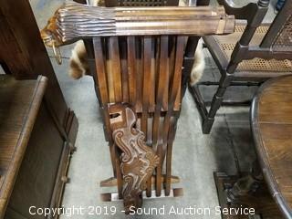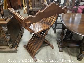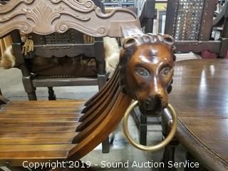 Item Description: Carved Lion head armrests, with a carved removable back so it folds up for easy storage. Matches one we had a couple of auctions ago. 33" H x 25" W x 20" D.