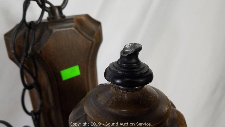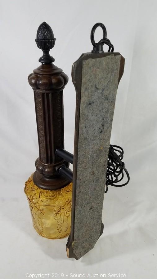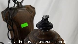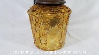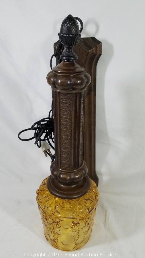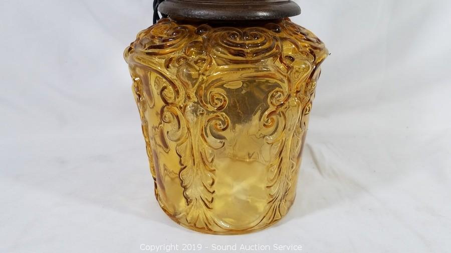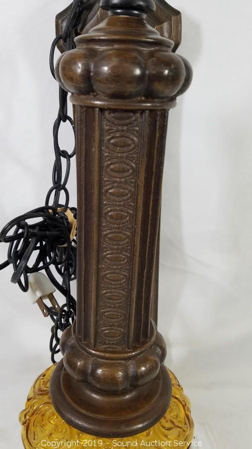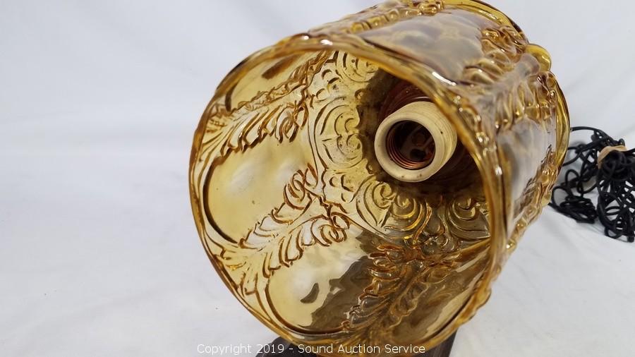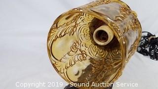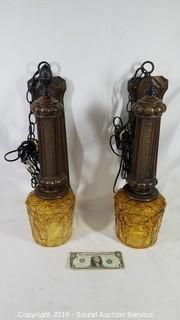 Item Description: Amber glass shades. Approx. 20" H, 6" x 8". Both wired. One has a broken piece.