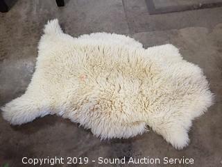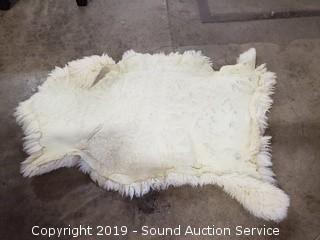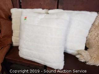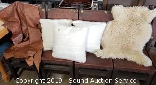 Lot #0319: Sheepskin Rug, Scrap Leather & 3 Faux Fur Pillows