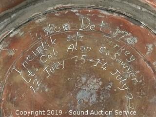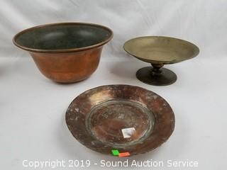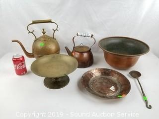 Lot #0131: Vtg. Copper Tea Pots, Bowls, Plaque & Ladle