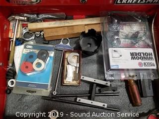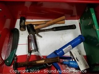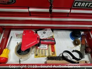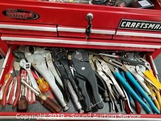 Item Description: Drill Bits, Wrenches, Pliers, Vise Grips, Mini 1/4" Torque Wrench, Starrett Caliper w/Box, Window Holder, Adjustable Reamer, Mallets & More. Tool chest is in excellent condition, locking with key, 10 ball bearing drawers. 49" H x 27" W x 17" D.