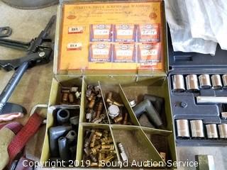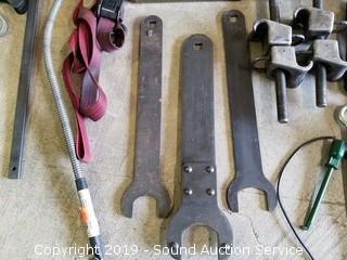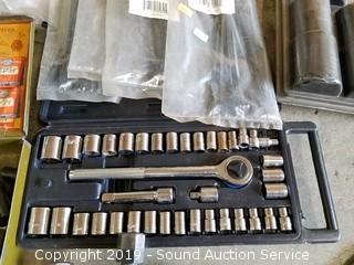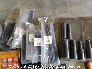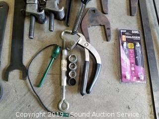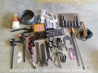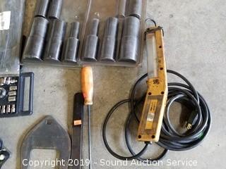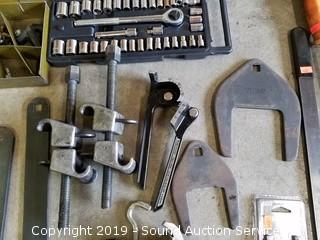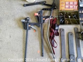 Item Description: Socket set, tons of various length zip ties, drop light, 16" rail clamps, tie down straps, 3/16" to 3/8" tube bender, Ford fan clutch wrenches, and more.