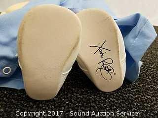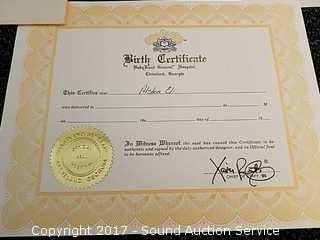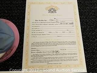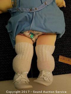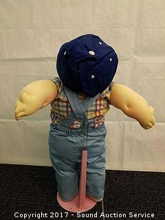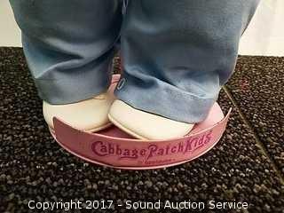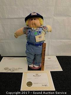 Soft sculpture with Cabbage Patch Kids stand, adoption papers / COA, original clothing and embroidered tag. Facsimile Signed. Approx. 21" tall.