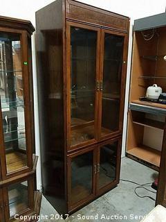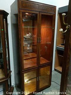 Lighted with glass shelves and brass hardware, shelves have plate racks. Approx. 76" tall, 32" wide & 18" deep.