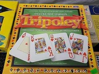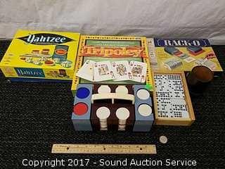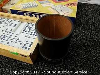 Includes: Leather Dice Cup, Yahtzee, Rack-o, tripoley, dominoes and more.