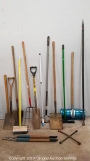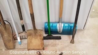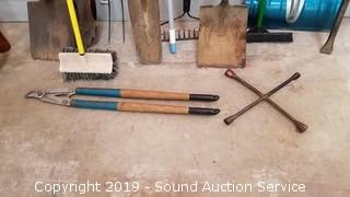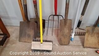 Item Description: Shovels, digging bar, loppers, pitchfork, brush rake, broom, tire iron, and more.