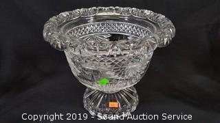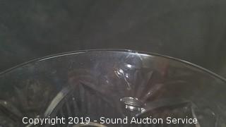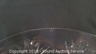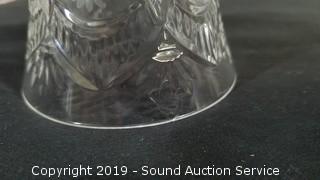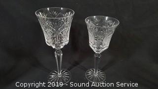 Item Description: Do not think the candle holders are crystal. Includes: Compote, pitcher, vase, 2 candle holders, (9) 7-3/4" wine glasses (2 have chips), and (10) 8-3/4" wine glasses.