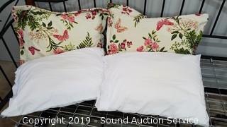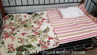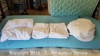 Item Description: Comes with box spring cover with velcro dust ruffle set, mattress pad, sheet set, white blanket, comforter, pillows with cases, body pillow and decorative pillow, Perfect Day mattress and box spring, fabric tufted headboard with rails. In good condition.