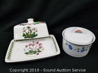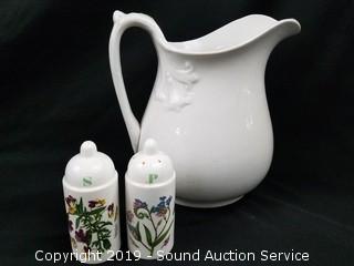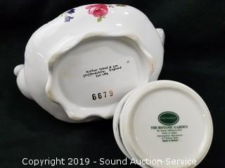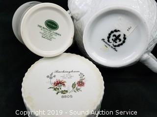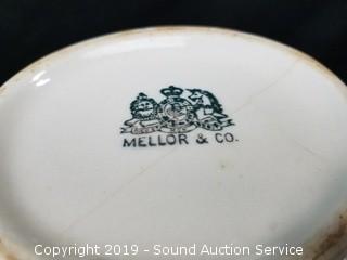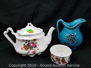 Item Description: Count includes lids. One of the teapots is an Arthur Wood & Sons England, has a chip. Pitcher is Mellor & Co.