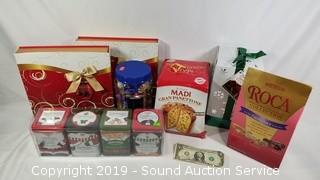 Item Description: Swiss Miss Variety Pack BB March 2020, Gran Panettone Italian Cake BB July 31 2019, 2 Boxes Belgian Chocolate Crepes BB Oct 2019, Chocolates of the World BB July 01 2019 (Expired), Fudge Mint Cookies BB March 2019 (Expired), and Sea Salt Caramel Roca BB June 2020.