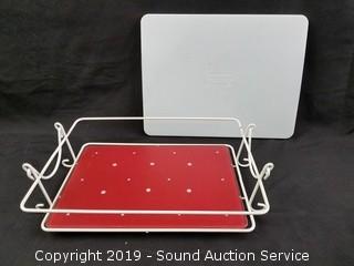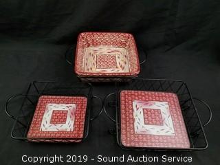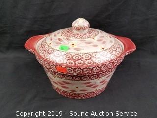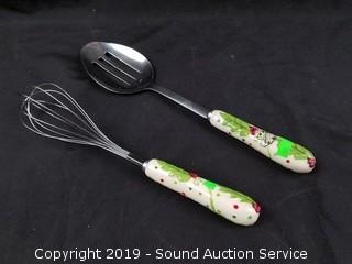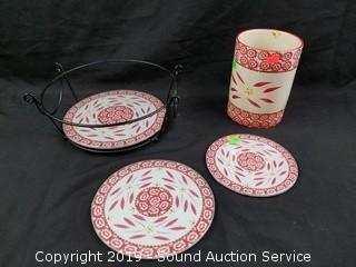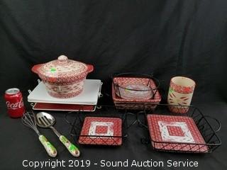 Item Description: Covered dutch ovens, casserole dish, utensil canister, trivets, wire racks and porcelain handled utensils.