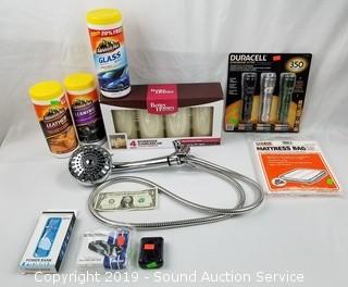 Item Description: 2 Portable Power Banks, Samsung Ear Buds, 3 Duracell LED Flashlights w/Batteries, Mattress Bag, 4 Flameless LED Candles, Waterpik Duel Power Pulse Massaging Shower Head, 3 Bottles of Armor All Leather Wipes.