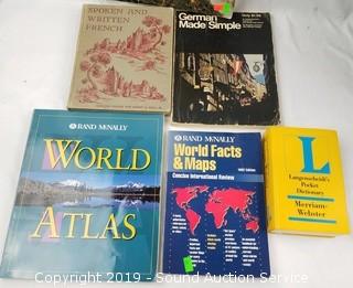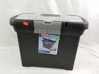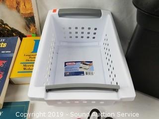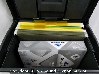 Item Description: File box contains printer paper, note pads, hanging file folders, scissors, various world maps and Royal paper shredder AG1X.