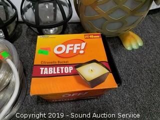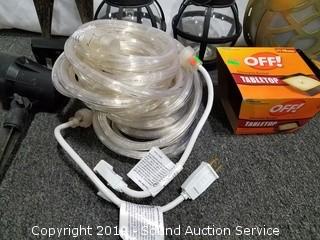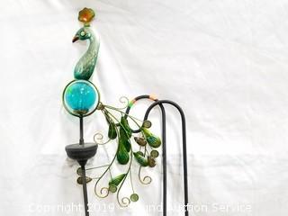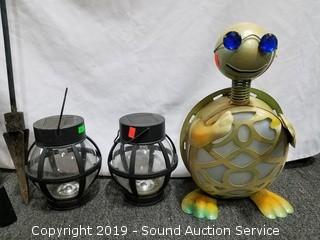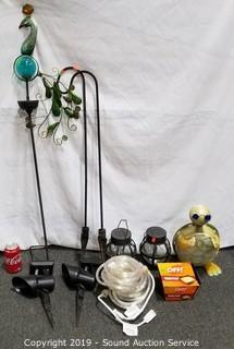 Item Description: Citronella Bug Repellant, Solar Stake Spot Lights, Rope Light, 36" Shepard Hooks, Metal Art Turtle & Peacock, & Solar Lanterns.