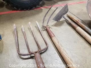 Item Description: Hoe, cultivators, pitchfork, digging bar, shovels, and more.