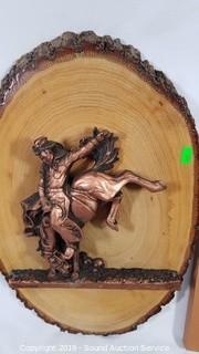 Item Description: Rodeo plaque, Scrimshaw fishing artwork, fishing figures, captain's ashtray, hand painted circular saw blade signed "CH", deer hunter plaque, 2 wooden trinket boxes, and "Peace" jar.