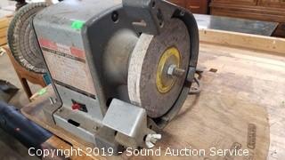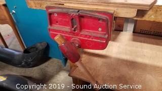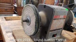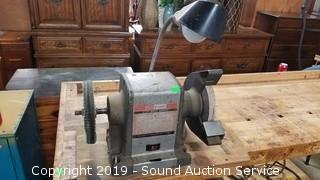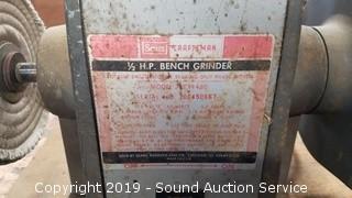 Item Description: 6" bench grinder with spare grinding wheel and Craftsman 10" vise mounted to it. Has built-in electrical outlets. Approx. 36" H, 61.5" x 25".