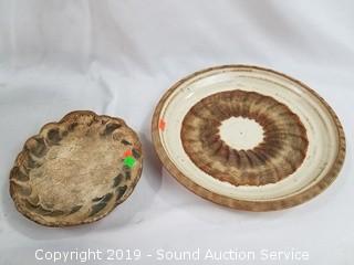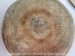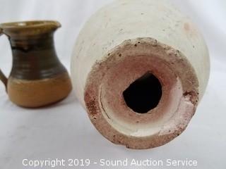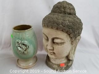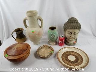 Item Description: Some are signed. Includes: large hand made vase (has hole in the bottom, 16" x 8"), hand made pottery Thailand bust, covered dish, and more.