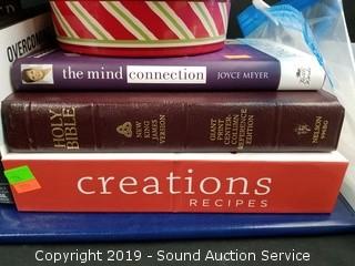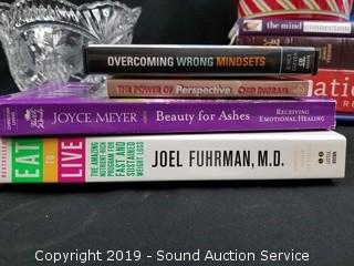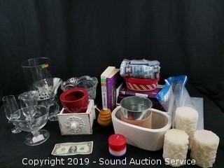Item Description: Books, glassware, decorative candles, honey pot, and more.
