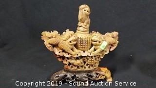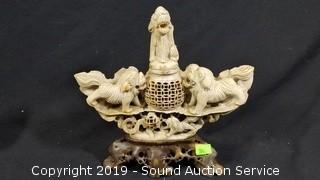 Item Description: Incense holder, soap dispenser. All are elaborately carved. Foo dogs are approx. 8" x 8".