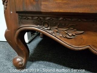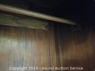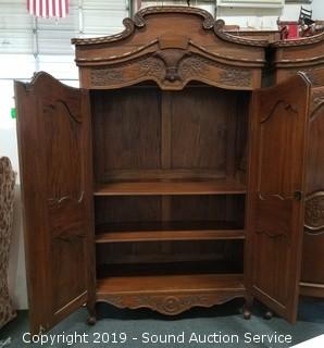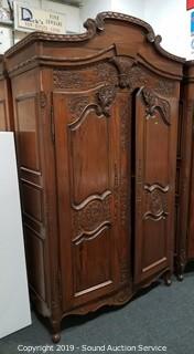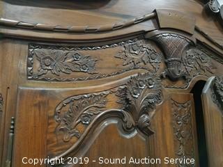Item Description: Beautifully carved solid Mahogany, Skeleton key lock, no key. Left door is warped a bit wont stay latched, otherwise in excellent condition. Comes with a beautifully carved rose finial, not attached. Consignor paid $4,500 for this armoire reduced from $9,000 from the Sea Bridge Trading Co. 91-1/2" H x 52" W x 22" D.