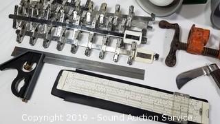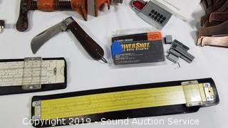 Item Description: Security Flood Light, Bulbs, Krazy Glue, Slide Rules (One is a Pickett No. N902-ES), Carpenters Square, Respirator Mask, Spray Adhesive, Furniture Restore, Water Pump & More.