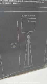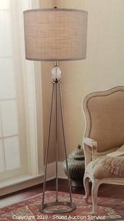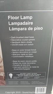 Item Description: Unassembled in original box, complete, works, shade had a dent popped it out. Dark brushed steel base with decorative crystal sphere. 61.5" H x 16" D.