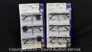 Item Description: 3 pairs full frame metal (no cases, one pair is missing a nose pad), and 3 pairs semi-rimless plastic (with 3 coordinating cases).