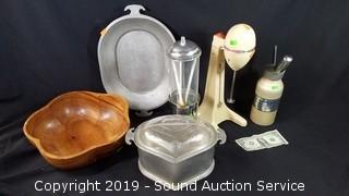 Item Description: Kidde Whippets whip cream dispenser, Hamilton beach Drink Master, 2pc. Guardian Ware (one with lid), and wood bowl.