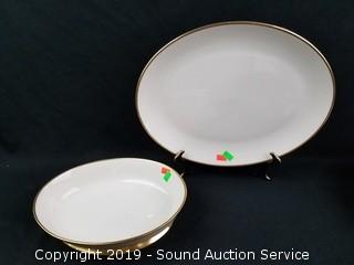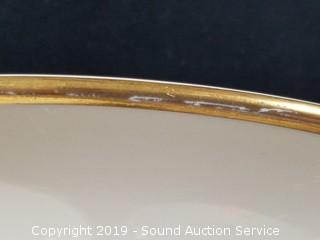 Item Description: 9 salad plates, 10 snack plates, 10 dinner plates, 10 cups, 10 saucers, 10" oval serving bowl, and 14" platter. Some minor wear to the gold trim, do not see any chips or cracks.