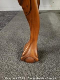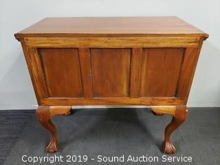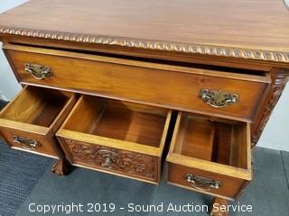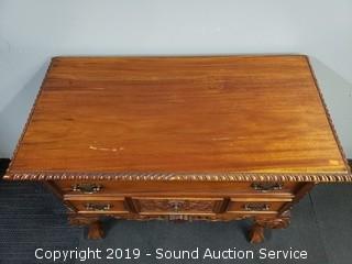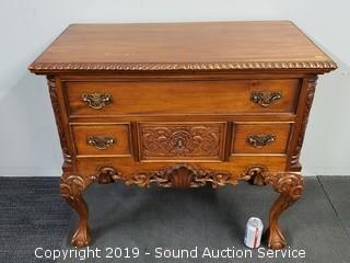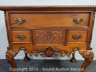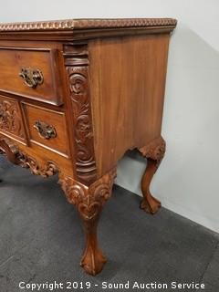 Item Description: Beautifully crafted, possibly hand hewn, dovetail construction, ornately carved in fine detail with cabriole claw & ball feet. A few minor scuffs & scrapes, otherwise excellent condition. 32" H x 35-1/2" W x 18" D.