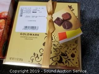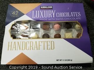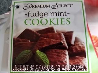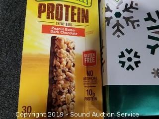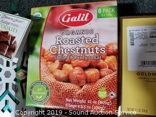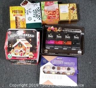 Item Description: Nature Valley Dark Chocolate Protein Bars BB June 27 2019, Godiva Belgian Assorted Chocolates BB May 2019, Organic Roasted Chestnuts BB Aug 2018, Fudge Mint Cookies BB March 2019, Pre-Built Gingerbread House Kit (Some damage) BB March 2019, Pete's Nespresso Coffee Capsules BB July 05 2019, and Kirkland Assorted Chocolates BB March 31 2019.