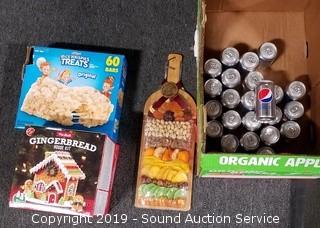 Item Description: Pre-Built Gingerbread House Kit BB March 2019, 25 Cans Diet Pepsi BB March 2019, Fine Dried Fruits & Nuts w/Bamboo Cutting Board BB May 2019, and Rice Krispies Treats BB April 2019
