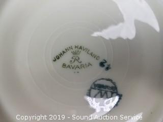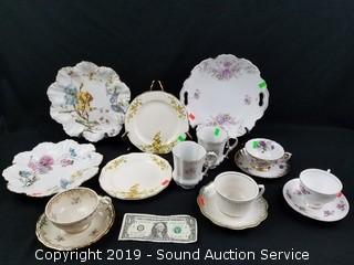 Item Description: 2 Winrose cups, Clare English teacup & saucer, Johann Haviland teacup & saucer, 2 unmarked teacups & saucers, 2 Carrollton snack plates, 2 Limoges floral hand painted plates, and handled plate.