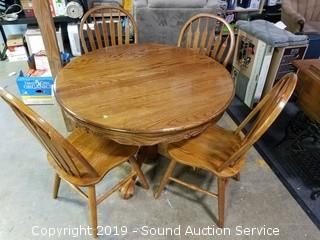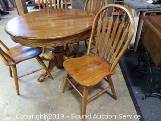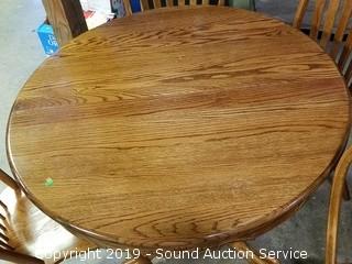 Item Description: Table and 4 slat back chairs. Some wear to the finish, in overall good condition. Approx. 29" H, 44" diameter.