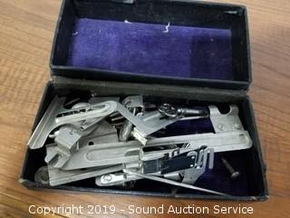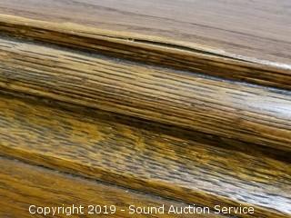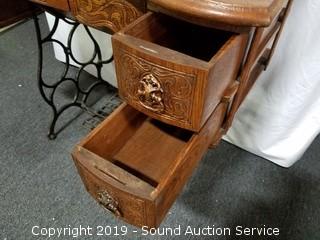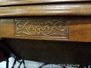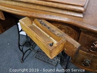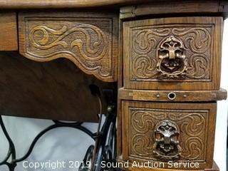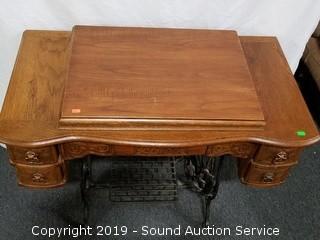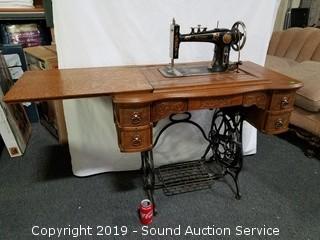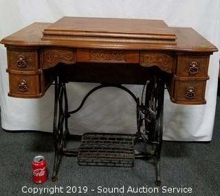 Item Description: Comes with accessories. Nice oak cabinet (some of the veneer top is coming free), cast iron base treadle, works, can't get it to spin the sewing machine. Approx. 32" H, 35" x 19" when closed.