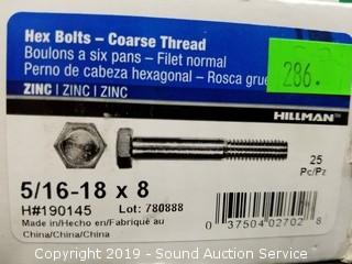 Lot #0286: 50ct 8" x 5/16"-18 Zinc Coarse Thread Hex Bolts