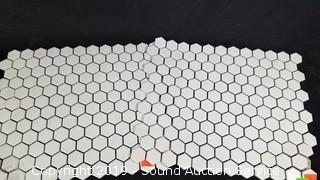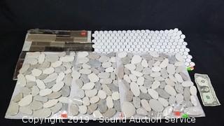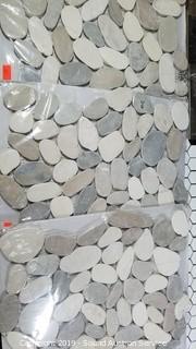 Item Description: 3 pebble sheets, 2 hexagon sheets, and glass mosaic sheet. Each sheet covers 0.96 sq. ft.