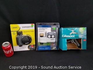 Item Description: Orbit 2 dial digital faucet timer, 1 outlet digital watering timer, and Gilmore circular sprinkler.
