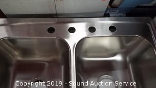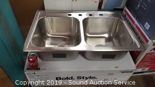 Item Description: Model R3847-4-NA. One corner is a little bent out of shape. 9-in equal double-basin depth, Double equal bowls, 36-inch minimum base cabinet width. $196 retail value. #363664.