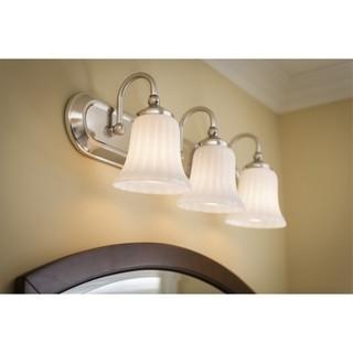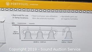 Item Description: Portfolio Shaker Park 3-Light Brushed Nickel Oval Vanity Light. One of the shades is broken. Works. #0030850. 24.02" x 6.93" x 8.5".