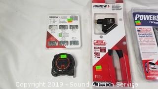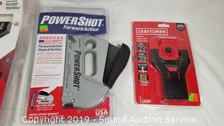 Item Description: Craftsman stud sensor 1" wood 1.5" metal, Arrow swivel head riveter with rivets (riveter head is missing a screw), Power Shot Forward Action Stapler and Crescent Lufkin 25ft tape measure.