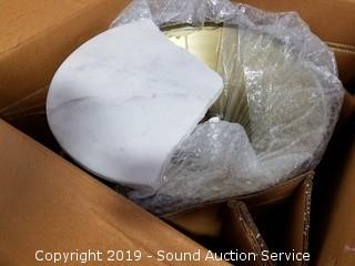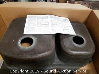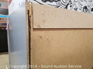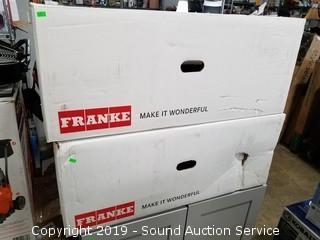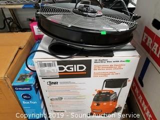 Item Description: 2 Franke composite granite sinks (both are broke, one comes with piece, can be repaired), grey cabinet (one side is damaged), box fan, floor fan, Ridgid 16gal wet dry vac, entry rug, quartz top table (broken top), and more.